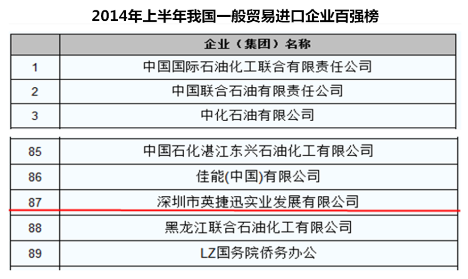 熱烈恭賀英捷迅在進(jìn)口企業(yè)百?gòu)?qiáng)榜中榮列第87位!為中國(guó)的進(jìn)出口事業(yè)做出巨大貢獻(xiàn)!