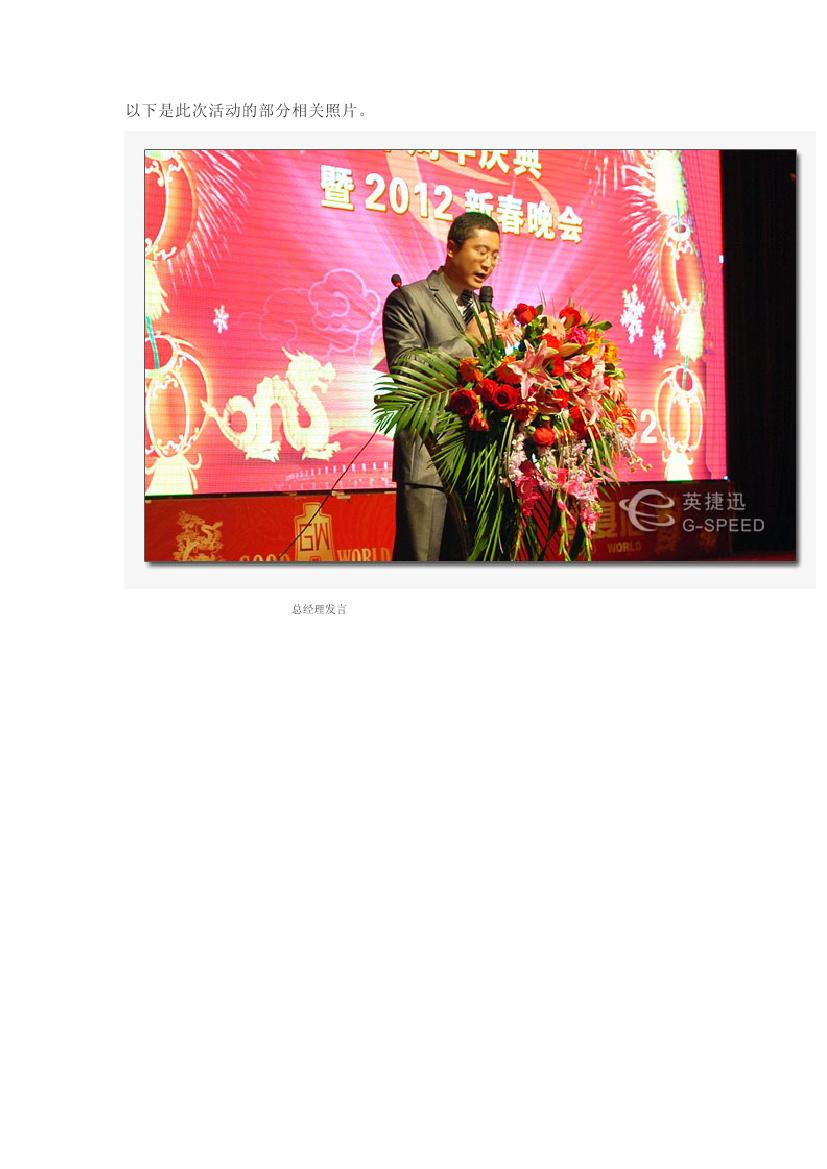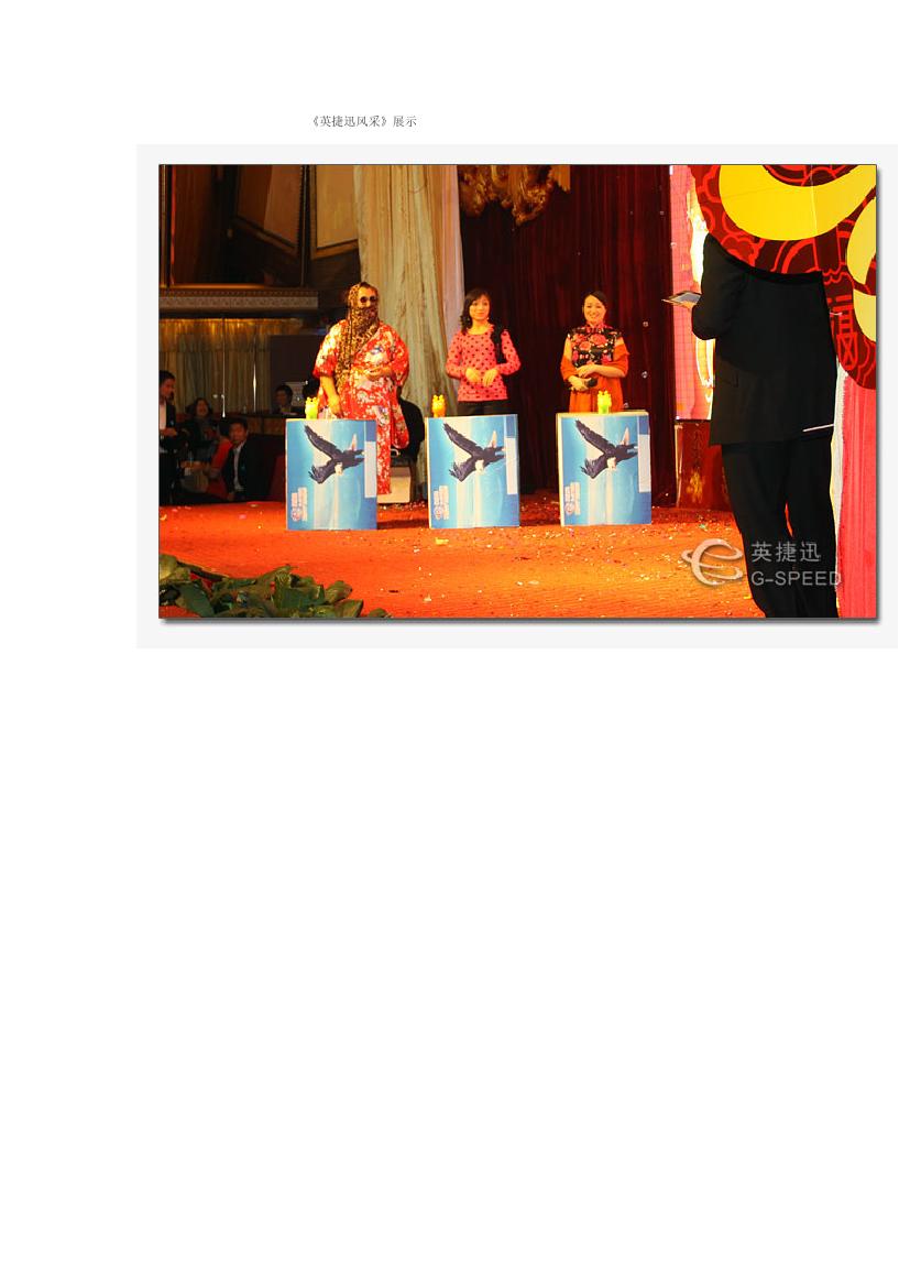 本場晚會精心籌備,組織有序,歡快熱烈,邀請600多英捷迅貴賓出席。宴會在熱烈、友好、祥和的氣氛中進行。宴會上,公司總經(jīng)理邢云慶先生所作了十周年致詞。歌舞《開門紅》拉開了晚會的序幕,動聽的歌聲、優(yōu)美的舞姿表達了對公司的美好祝福;綜藝類《英捷迅風采》展示了我司業(yè)務(wù)團隊的凝聚力,鼓舞人心;公司“年度優(yōu)秀員工”頒獎儀式熱烈隆重;自編自導(dǎo)自演的小品《非誠勿擾》及舞蹈《天鵝舞》幽默風趣,笑聲不斷;唯美的舞蹈《roly poly》、《女人幫》讓大家領(lǐng)略了公司員工的多才多藝;小合唱《我相信》極富感染力,贏得了大家陣陣掌聲;穿插其間的優(yōu)秀員工頒獎、抽獎樂翻天和十周年祝賀短片,既給大家?guī)砹撕眠\,又送去了祝福。歷時近3個小時的晚會一直在喜慶和歡樂的氣氛中進行,演員投入的表演,觀眾熱情的參與,將晚會一次次推向高潮。